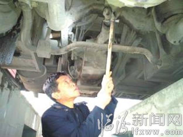 車輛剛駛入車輛檢驗室的安全例檢場所,孟亞文已開始了車輛外觀的檢查工作。只見他進入一米多深的地溝內,逐個檢查著車輛輪胎、傳動軸支架等部件,還時不時地敲打著螺絲。