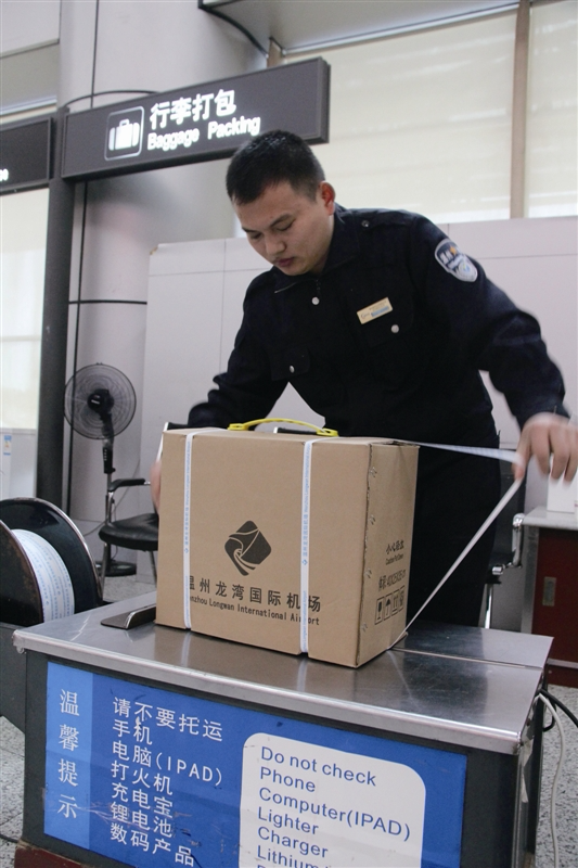 2月3日,溫州龍灣國際機場,周業明正在給旅客打包行李 溫都記者 鄭之越/攝
