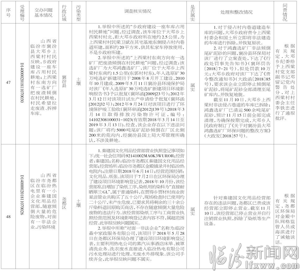 臨汾市關于中央生態環境保護督察“回頭看”交辦群眾信訪舉報問題邊督邊改情況通報