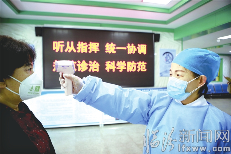 臨汾新聞網訊 1月30日,在市第三人民醫院門診大廳入口處,一位護士在給正常住院的患者家屬測量體溫。自確定為我市新型冠狀病毒感染的肺炎醫療救治市級定點醫院以來,該院實行最嚴格的防控措施,全力以赴做好疫情防控工作。