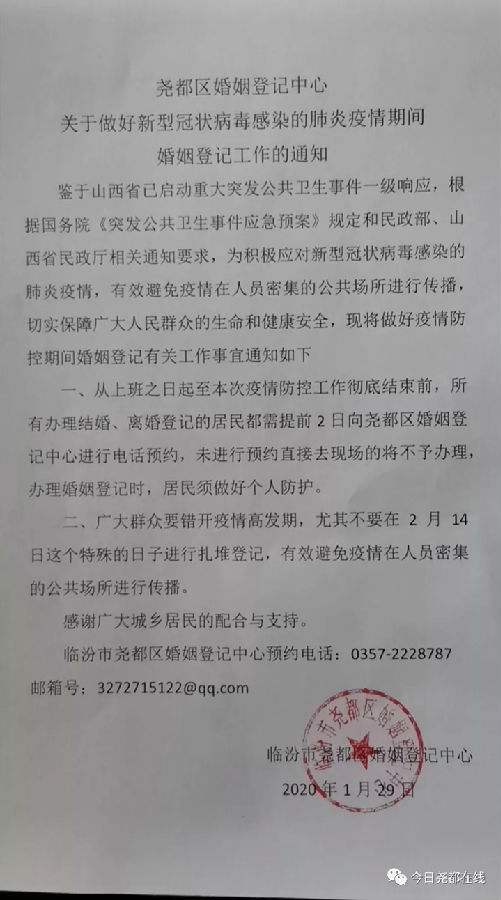 一、從上班之日起至本次疫情防控工作徹底結(jié)束前,所有辦理結(jié)婚、離婚登記的居民都需提前2日向堯都區(qū)婚姻登記中心進行電話預(yù)約,未進行預(yù)約直接去現(xiàn)場的將不予辦理,辦理婚姻登記時,居民須做好個人防護。