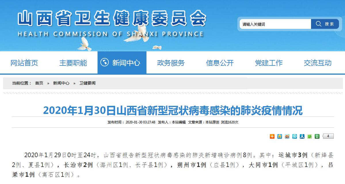 2020年1月29日0時(shí)至24時(shí),山西省報(bào)告新型冠狀病毒感染的肺炎新增確診病例8例。其中:運(yùn)城市3例(新絳縣2例、夏縣1例),長治市2例(潞州區(qū)1例、長子縣1例),朔州市1例(應(yīng)縣1例),大同市1例(平城區(qū)1例),呂梁市1例(離石區(qū)1例)。