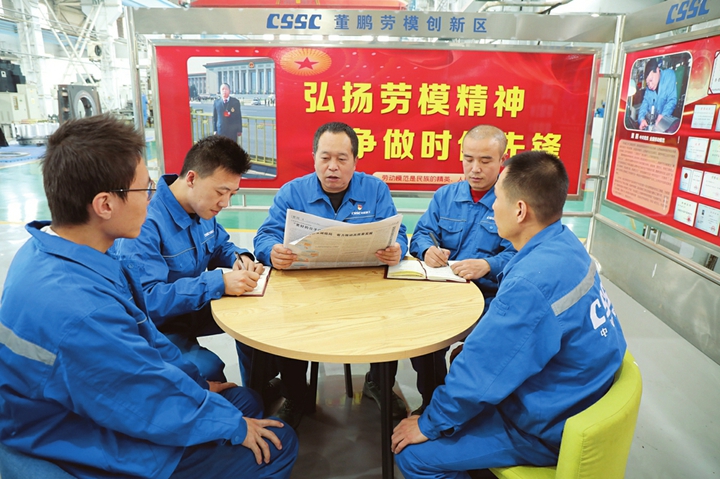 工作間隙,董鵬組織班組內(nèi)青年職工讀報、看新聞,學(xué)習(xí)黨的二十大精神。青年職工李仁杰感觸最深的是報告中講到的“堅持尊重勞動、尊重知識、尊重人才”,他說:“這十年,我感覺國家對技術(shù)工人的重視和支持力度越來越大,作為一名一線產(chǎn)業(yè)工人,要在自己的工作崗位上埋頭苦干,讓青春在全面建設(shè)社會主義現(xiàn)代化國家的火熱實踐中綻放絢麗之花。”