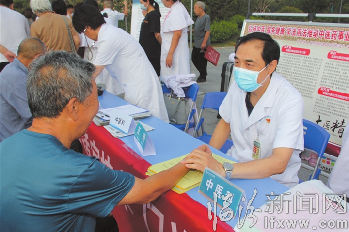 臨汾新聞網訊 8月11日上午,市衛健委組織多家醫療機構在市區平陽廣場開展《山西省中醫藥條例》宣傳及義診活動。圖為市中心醫院醫務人員正在義診。