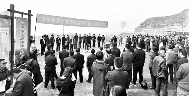 地處黃土高原殘垣溝壑區的大寧縣,三川十垣溝四千,周圍大山包一圈”,溝壑縱橫,生態脆弱,又是國定貧困縣,貧困發生率24.6%,脫貧攻堅任務繁重。面對“生態建設”與“脫貧攻堅”兩大難題,大寧縣深入貫徹習近平總書記“兩山”理論,按照省委、省政府和市委、市政府的決策部署,在脫貧攻堅中踐行新發展理念,讓群眾認識到常青樹就是搖錢樹,生態優勢就是經濟優勢,把生態建設的過程變成經濟增長方式轉變的過程、發展觀念不斷進步的過程、人與自然關系趨向和諧的過程,融生態文明于脫貧攻堅全過程,在山區宜農則農、宜林則林,推動綠色發展、建設美麗大寧,讓綠色成為美麗大寧的“底色”。他們在大寧縣第十二次黨代會上明確提出“購買式造林”,要實現——