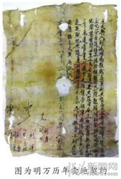 臨汾新聞網訊 一份泛黃的麻紙,讓時光穿越回明代,原來這是一份明代萬歷三十八年(公元1610年)的契約,距今已經有400多年的歷史。“這份契約有點殘缺,但記錄內容還算完整。”蒲縣克城鎮公峪村的劉先生介紹,這是祖上一代一代傳到他手中的。