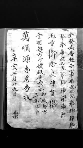 這張信紙已經泛黃,長18厘米、寬13厘米,記錄了商號的發貨數量、價格等相關信息。書信內容為:今發去香面子一車,布皮六包、席皮六包(分別用清代計數法蘇州碼子,記錄了每一包的重量),毛重1910斤,除皮凈貨1875斤,言明每百斤價銀壹兩一分,腳銀(即運費)每百(斤)三分四。最后寫著“萬順源香房查收”,落款時間為“辛亥七月廿九日”。書信上還有兩枚印章,一枚在數字處,內容為“福源成記”菱形印章;一枚在書信的右下角,內容為“堯都福源成記”長方形押角章。