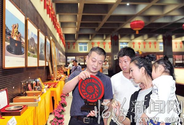 臨汾新聞網訊 5月24日,在我市古城公園舉辦的臨汾非遺精品展上,山西尚堯文化藝術有限公司的工作人員在為觀展者介紹炭雕創意龍盤工藝品。
