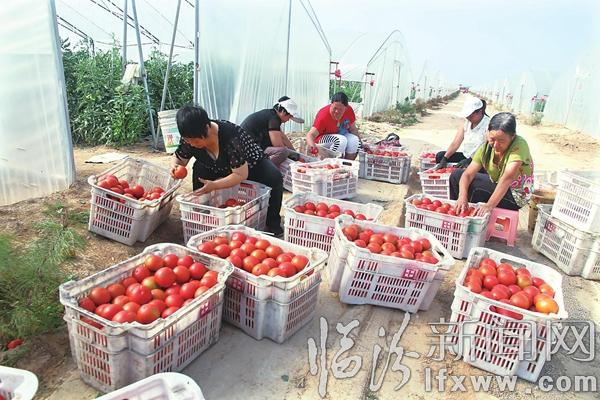 圖為菜農(nóng)們把剛從春秋大棚內(nèi)采摘下來的西紅柿整理裝箱。