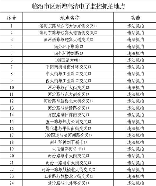 為進一步強化全市道路交通管理,規范道路交通秩序,最大限度地預防和減少道路交通事故的發生,保障廣大人民群眾的生命財產安全,根據《中華人民共和國道路交通安全法》及相關規定,臨汾市公安局交通警察支隊定于2014年12月1日起,正式啟用市區新增高清電子監控抓拍系統,并對機動車違法行為進行抓拍并依法實施處罰,望廣大群眾自覺遵守交通法律法規,安全行駛,并相互轉告,共同維護好我市道路交通秩序。