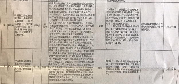 截至5月31日,臨汾市共接到中央第二環境保護督察組移交舉報案件三十一批223件。第一至三十批221件問題已按要求查處上報,其中,220件問題已辦理完畢,1件未完成整改問題正在加快推進(第一批1件)。第三十一批2件未到期案件正在進行核查。累計罰款300.6417萬元,行政拘留11人。共問責處理210人。其中,撤銷黨內職務1人,黨內嚴重警告5人,黨內警告20人,撤職3人,行政記過9人,記過4人,行政警告20人,警告3人,免職1人,誡勉談話79人,約談69人,通報批評6人。(備注:有8人被分別給予2個處理,1人被分別給予3個處理)