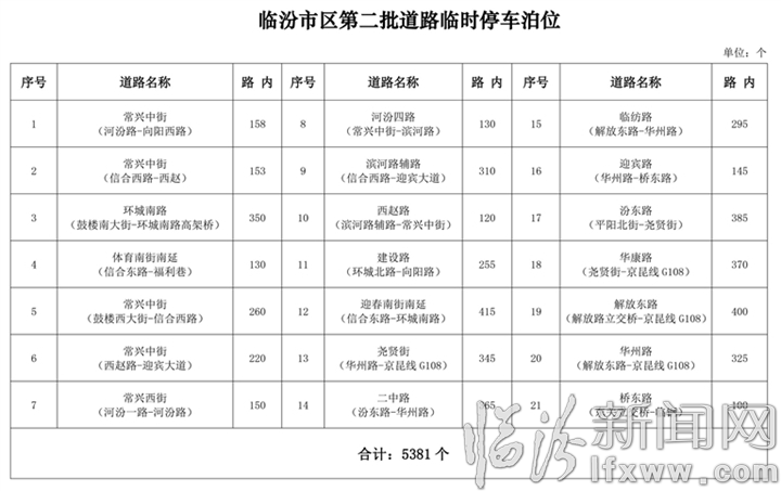 為緩解城區停車難問題,方便群眾路內臨時性停車,根據公安部《城市道路路內停車泊位設置規范》、《臨汾市機動車停車場管理辦法(試行)》等法規規定,確定第二批道路臨時停車泊位共5381個。