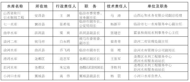 臨汾市2023年中型水庫防汛責任人名單