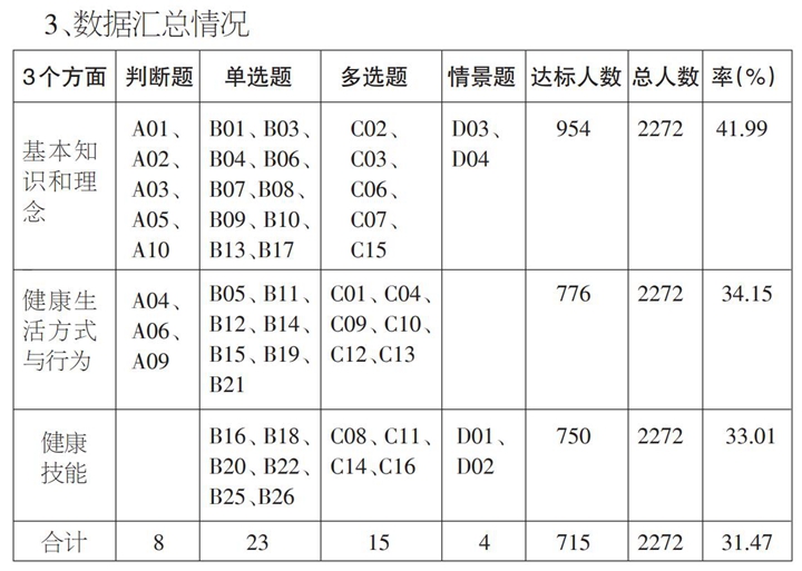 此次調查共發放問卷共獲得了效樣本2272個,80%以上715人,80%以下1557人。健康素養水平31.47%。基本知識和理念80%以上954人,居民基本知識和理念素養水平為41.99%,健康生活方式與行為素養80%以上776人。健康生活方式與行為素養水平為34.15%,基本技能素養80%以上750人,基本技能素養水平為33.01%。科學健康觀80%以上的1174人。科學健康觀水平為51.67%。傳染病防治80%以上的835人,傳染病防治水平為36.75%。慢性病防治80%以上的775人。慢性病防治水平為34.11%。安全與急救80%以上的1144人。安全與急求水平為50.35%。基本醫療80%以上的833人。基本醫療水平為36.66%。健康信息80%以上的949人,健康信息水平為41.77%。