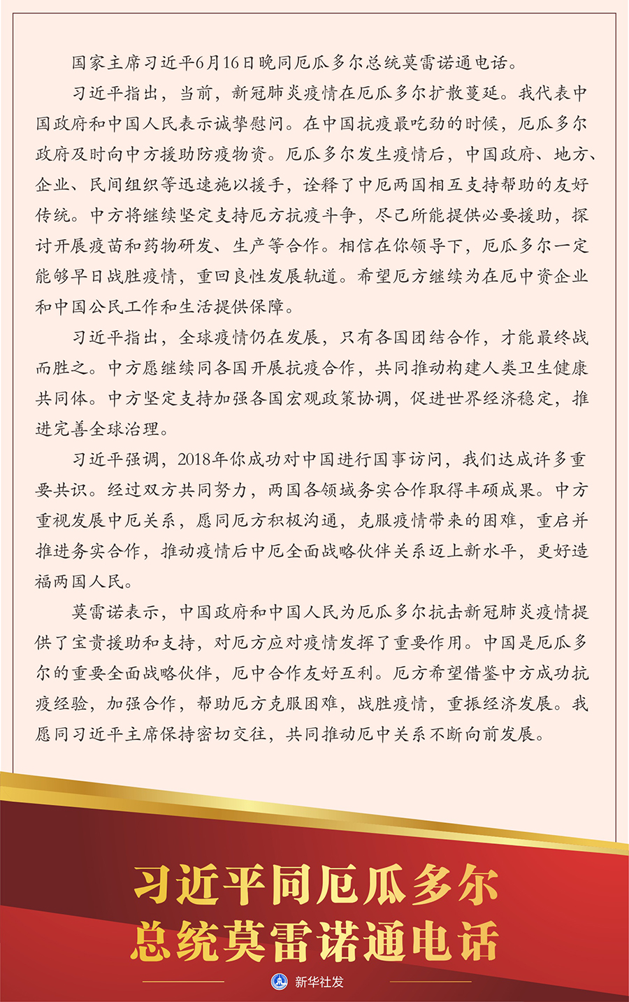 新華社北京6月16日電 國(guó)家主席習(xí)近平6月16日晚同厄瓜多爾總統(tǒng)莫雷諾通電話。