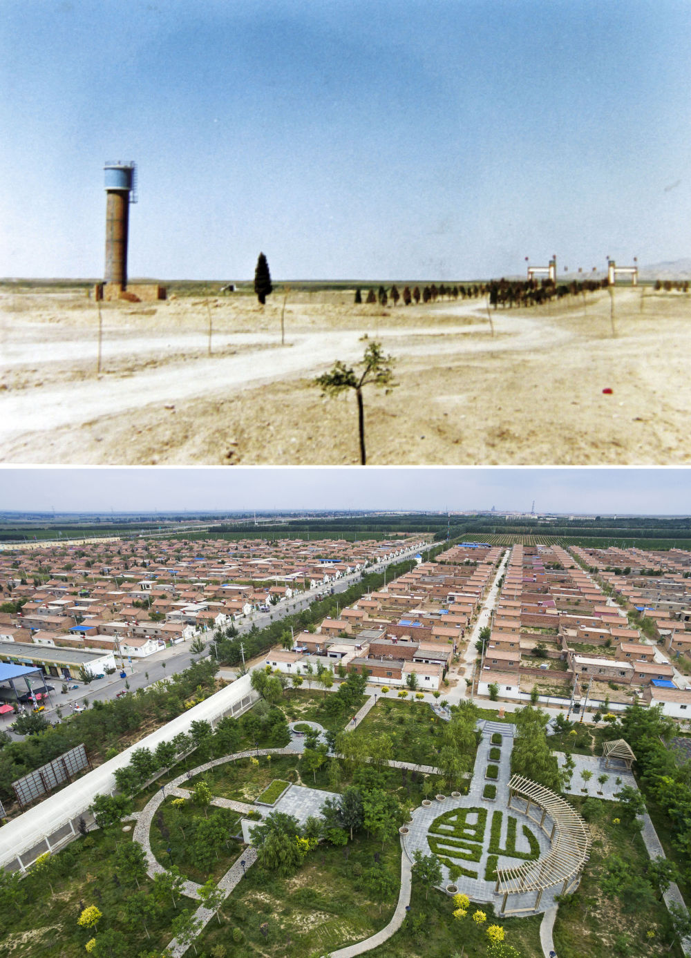 △上圖為寧夏永寧縣閩寧鎮建設初期的鄉鎮雛形;下圖為2016年7月22日拍攝的閩寧鎮原隆移民村。