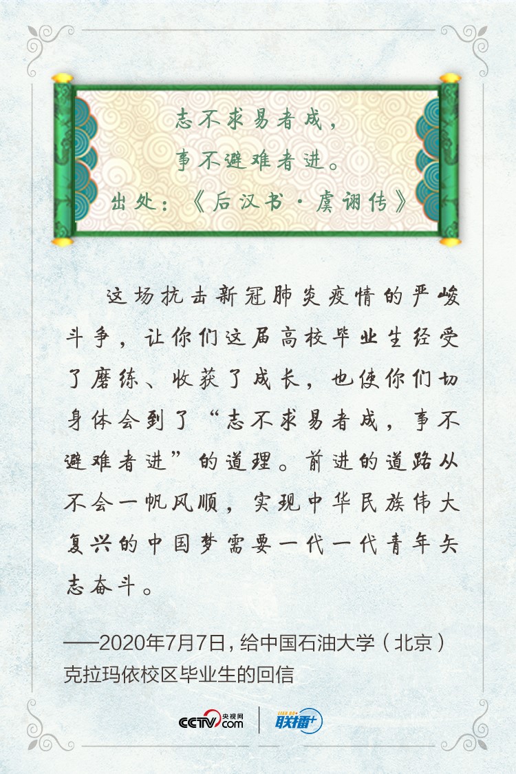 聯播+“這場抗擊新冠肺炎疫情的嚴峻斗爭,讓你們這屆高校畢業生經受了磨練、收獲了成長,也使你們切身體會到了‘志不求易者成,事不避難者進’的道理。前進的道路從不會一帆風順,實現中華民族偉大復興的中國夢需要一代一代青年矢志奮斗。”