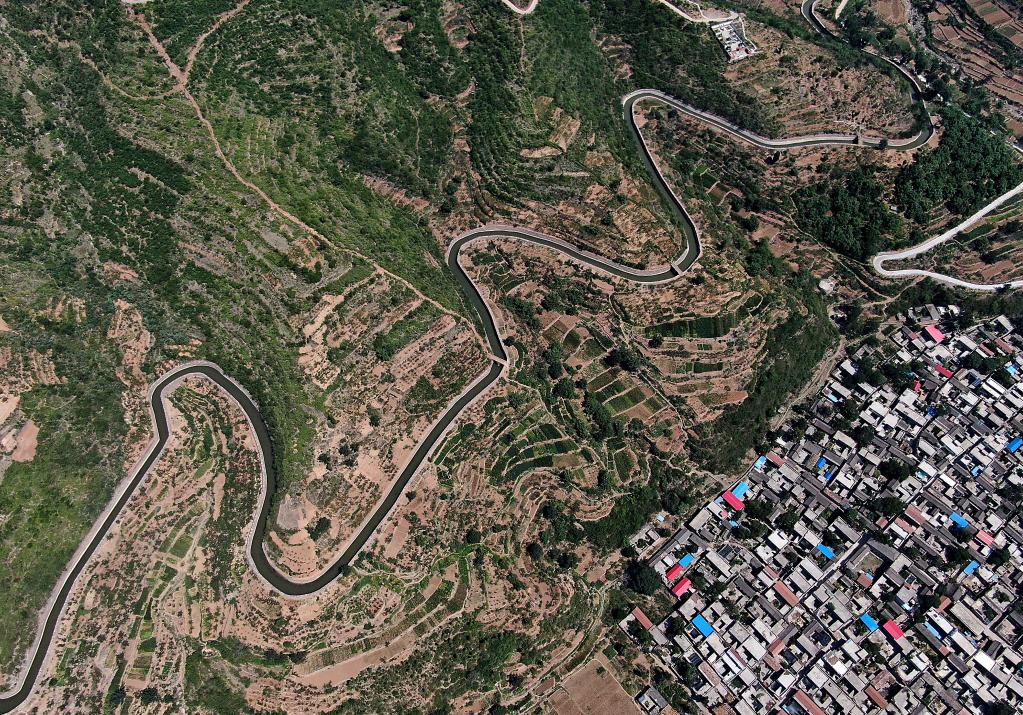 紅旗渠總干渠從一座村莊旁繞過(2019年7月5日無人機拍攝)。新華社記者 李安 攝