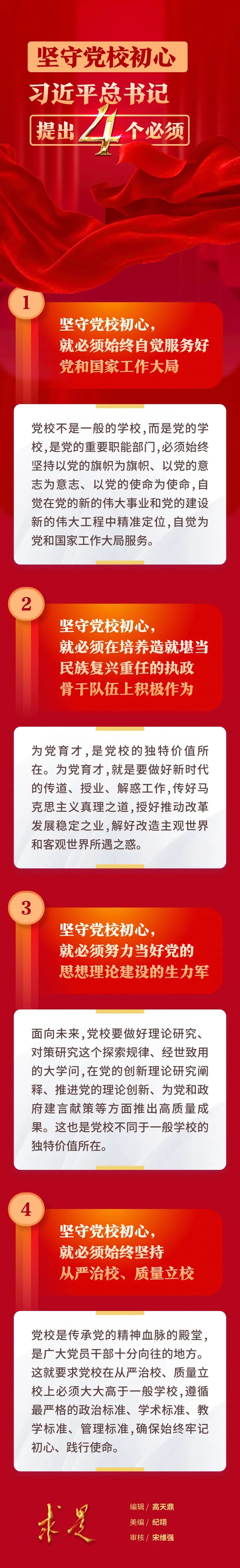 在2023年第7期《求是》雜志刊發(fā)的習(xí)近平總書(shū)記重要文章《在中央黨校建校90周年慶祝大會(huì)暨2023年春季學(xué)期開(kāi)學(xué)典禮上的講話(huà)》中,總書(shū)記深刻指出:“回顧歷史,黨校始終不變的初心就是為黨育才、為黨獻(xiàn)策”;“黨校初心始終是黨校不斷奮斗的根本動(dòng)力,也是黨校事業(yè)不斷發(fā)展的根本遵循”。如何堅(jiān)守黨校初心,總書(shū)記提出“四個(gè)必須”的重大要求。