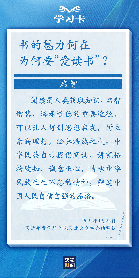 今天(4月23日)是世界讀書日。習近平曾多次講述和書籍的不解之緣,分享讀書學習的感悟,倡導“愛讀書、讀好書、善讀書”。書的魅力何在,為何要“愛讀書”?如何能“選好書”?怎樣“善讀書”?一起學習↓