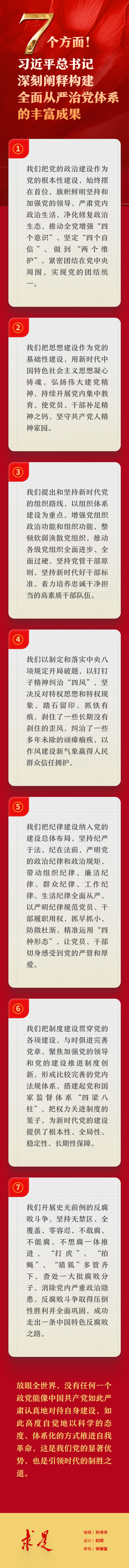 6月16日出版的第12期《求是》雜志刊發習近平總書記重要文章《健全全面從嚴治黨體系 推動新時代黨的建設新的偉大工程向縱深發展》。在這篇重要文章中,習近平總書記深刻指出:“構建全面從嚴治黨體系是一項具有全局性、開創性的工作。新時代10年,我們黨不斷深化對自我革命規律的認識,不斷推進黨的建設理論創新、實踐創新、制度創新,在構建全面從嚴治黨體系上積累了豐富成果。”