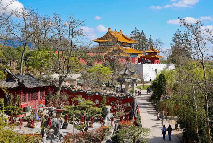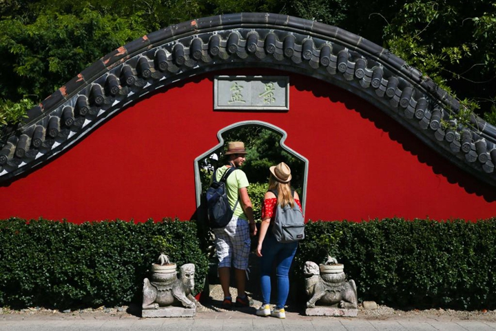 在比利時布呂熱萊特市,游客參觀天堂動物園的中國園。