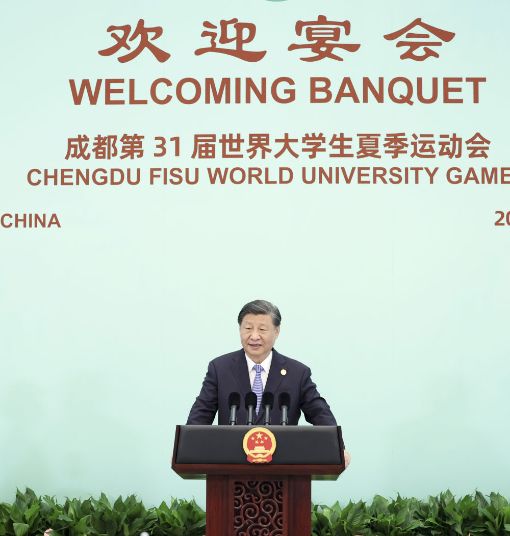 7月28日中午,國家主席習近平和夫人彭麗媛在四川省成都市金牛賓館舉行宴會,歡迎出席成都第31屆世界大學生夏季運動會開幕式的國際貴賓。這是習近平發表致辭。新華社記者 丁海濤 攝