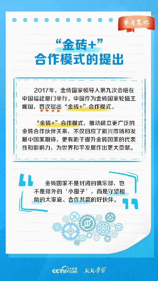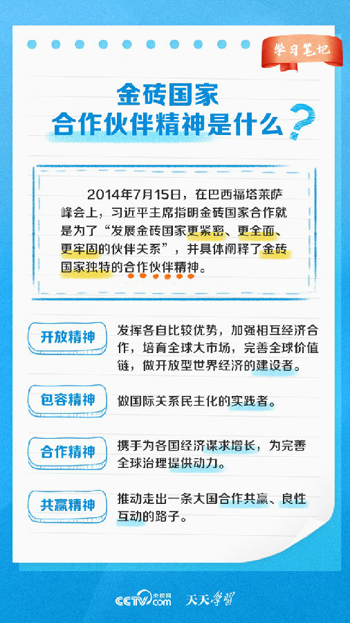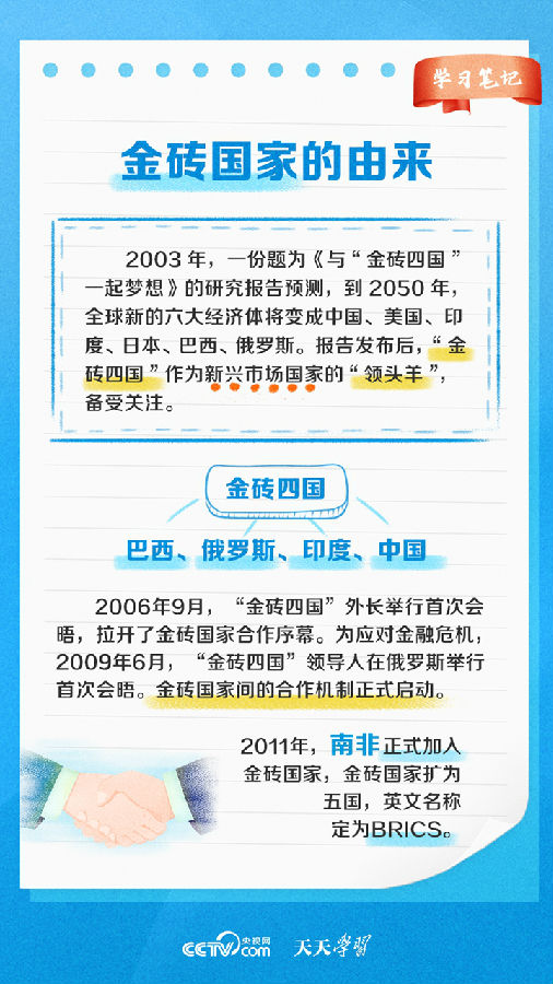 自金磚國家合作機制建立以來,金磚國家合作不斷走深走實,成為帶動世界經濟增長、完善全球經濟治理、推動國際關系民主化的重要力量之一?!短焯鞂W習》特推出《學習筆記》,與您一起了解金磚國家合作機制緣何擁有強勁生命力。