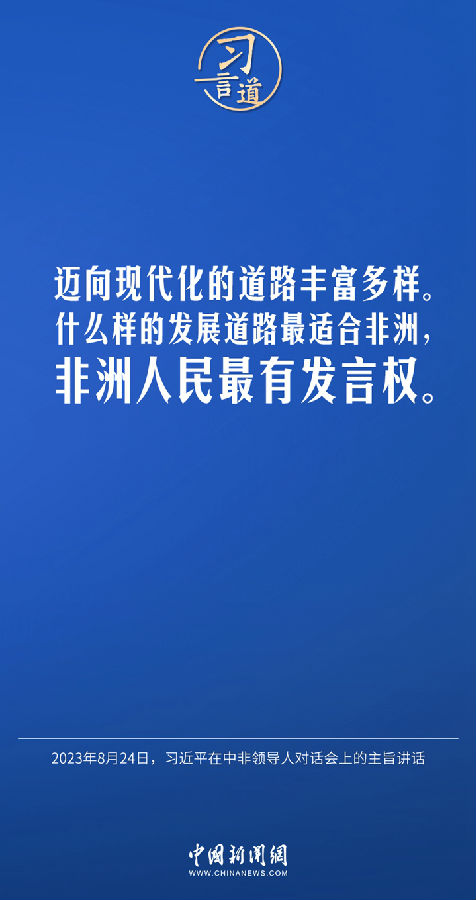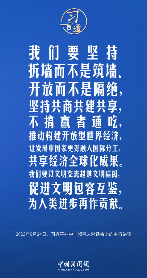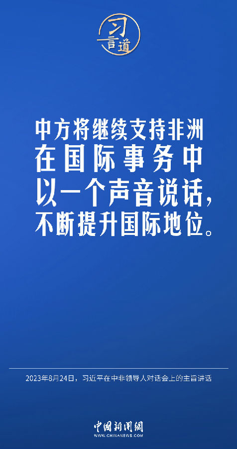 當(dāng)?shù)貢r(shí)間8月24日晚,國(guó)家主席習(xí)近平和南非總統(tǒng)拉馬福薩在約翰內(nèi)斯堡共同主持中非領(lǐng)導(dǎo)人對(duì)話會(huì)。習(xí)近平發(fā)表題為《攜手推進(jìn)現(xiàn)代化事業(yè) 共創(chuàng)中非美好未來(lái)》的主旨講話。習(xí)近平指出——