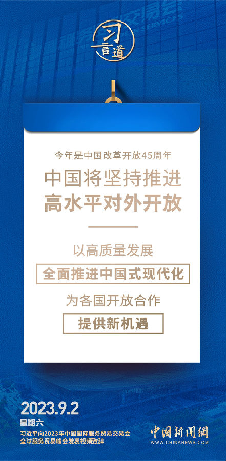9月2日上午,國家主席習近平在北京向2023年中國國際服務貿易交易會全球服務貿易峰會發表視頻致辭。習近平指出——