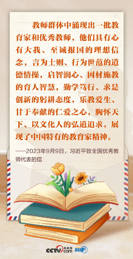 2023年9月9日,全國優秀教師代表座談會在北京召開。剛結束黑龍江之行的習近平總書記致信與會教師代表,充分肯定廣大教師為國家發展、民族振興作出的重要貢獻,深刻闡釋教育家精神的豐富內涵和實踐要求,希望大家以教育家為榜樣,大力弘揚教育家精神,為強國建設、民族復興偉業作出新的更大貢獻。