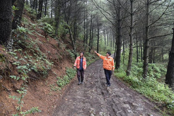 海雀村生態護林員馬正安(左)和海雀村林管員王光德(右)在日常巡山護林。新華社記者 李凡 攝