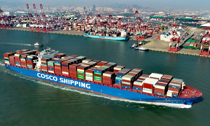 2021年2月19日,在位于山東自貿試驗區青島片區的山東港口青島港前灣集裝箱碼頭,一艘滿載集裝箱的貨輪駛出港口。