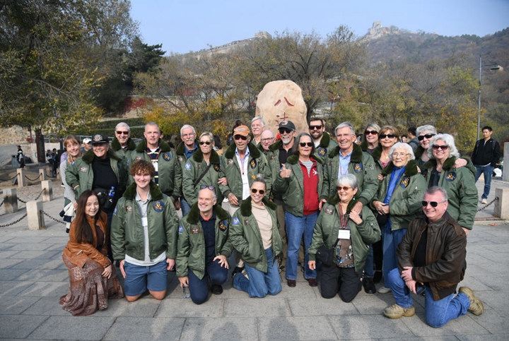 2023年10月29日,飛虎隊老兵莫耶一行人在北京八達嶺長城合影留念。當日,美中航空遺產基金會訪華代表團成員陸續抵達北京。新華社記者 任超 攝
