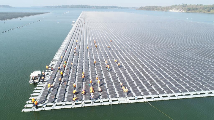 2021年1月23日,施工人員檢查泰國烏汶府詩琳通大壩綜合浮體光伏項目的太陽能板安裝情況。新華社發(泰國國家電力局項目組供圖)