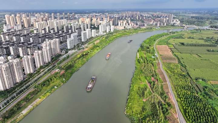 △ 2023年8月21日,安徽阜陽,初秋時(shí)節(jié),界首城市建設(shè)與沙潁河水系、橋梁和綠植相映襯,構(gòu)成一幅生態(tài)宜居的美麗畫卷。