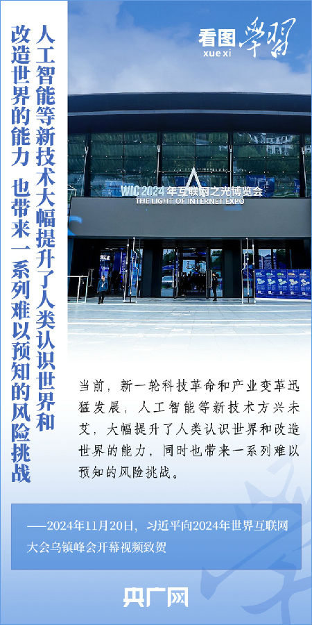 11月19日至22日,2024年世界互聯網大會烏鎮峰會在浙江烏鎮舉行。2014年以來,習近平主席以現場發表主旨演講、視頻致辭、賀信等多種形式關心世界互聯網大會的舉辦,提出建立多邊、民主、透明的國際互聯網治理體系,表示中國愿同世界各國一道,攜手構建網絡空間命運共同體,讓互聯網更好造福人民、造福世界。在世界互聯網再次開啟“烏鎮時間”之際,《看圖學習》梳理習主席關于“攜手構建網絡空間命運共同體”重要論述,與您一起學習領悟。