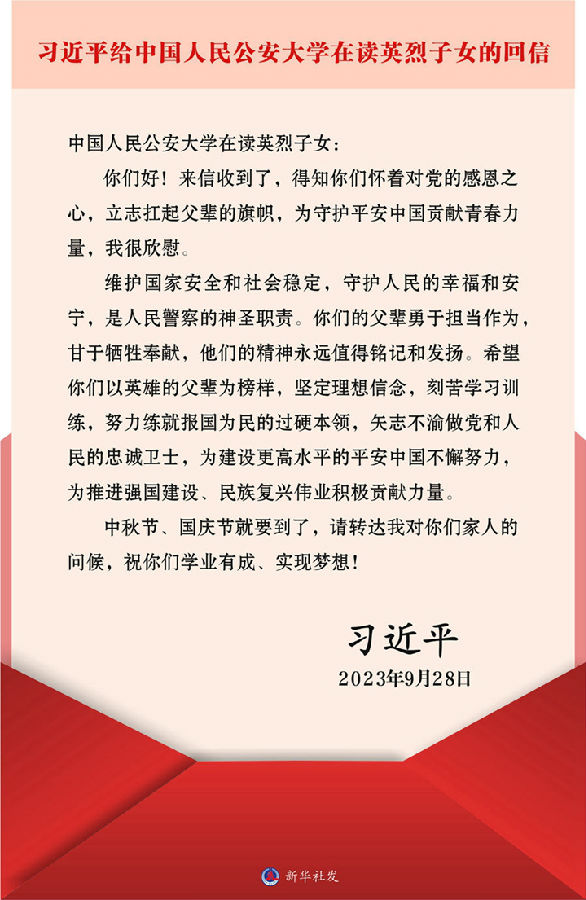 這是2023年中秋節(jié)、國(guó)慶節(jié)來(lái)臨之際,習(xí)近平總書(shū)記給中國(guó)人民公安大學(xué)在讀英烈子女的回信。
