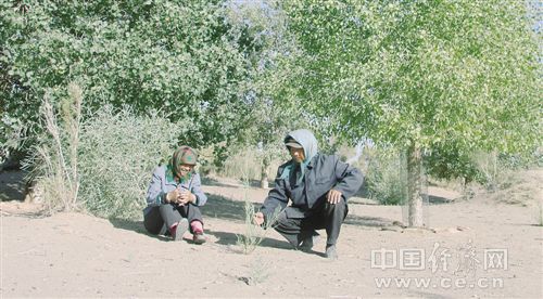 妻子臥床期間,圖布巴圖成了護理員和炊事員。后來妻子病情好轉,圖布巴圖就領著她在林地散步,告訴她那棵長得慢的小樹,他給起名叫“小老頭”;那兩棵胡楊,他給起名叫“鋼艮好耶樂”,漢語意思是“美麗的一對”。陶生查干疲憊地笑笑,說不出話。他把旗婦聯報選“全國最美家庭”的推薦表念給妻子聽,“每年春天的種樹季節,在阿拉善盟額濟納旗巴丹吉林沙漠邊緣,人們總能看到兩位老人身背水壺、手拿鐵鍬、埋頭苦干的身影,他們就是原古日乃蘇木的圖布巴圖和陶生查干夫婦……”陶生查干苦笑著搖搖頭,還是說不出話。