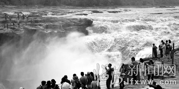 臨汾新聞網(wǎng)訊 近日,受上游降雨影響,吉縣黃河壺口瀑布水量大增,滾滾濁流奔騰而下,氣勢壯觀,吸引眾多游客前來參觀。圖為眾多游客在壺口瀑布游覽觀瀑。 呂桂明 攝