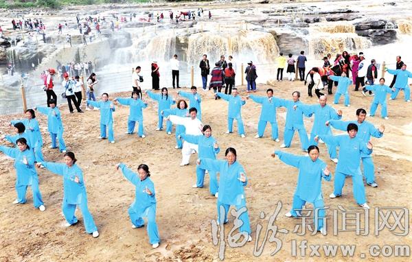 臨汾新聞網(wǎng)訊 近日,我市100余位太極拳愛好者在楊氏太極拳著名拳師楊軍的帶領(lǐng)下,來到吉縣黃河壺口瀑布景區(qū),為游客表演太極拳,展示太極拳這一非物質(zhì)文化遺產(chǎn)的魅力。(呂桂明)