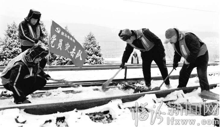 臨汾新聞網(wǎng)訊 連日來(lái),太鐵侯馬電務(wù)段干部職工積極應(yīng)對(duì)下雪天氣帶來(lái)的不利影響,迅速啟動(dòng)除雪應(yīng)急預(yù)案,投入到清掃鐵路道岔積雪的戰(zhàn)斗中,全力確保鐵路運(yùn)輸安全暢通。圖為該段職工在清掃鐵路軌道上的積雪。