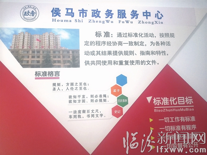 “標(biāo)準(zhǔn)助推創(chuàng)新發(fā)展,標(biāo)準(zhǔn)引領(lǐng)時(shí)代進(jìn)步。”步出中心四層的電梯,這行大字首先映入眼簾。侯馬政務(wù)服務(wù)中心標(biāo)準(zhǔn)化制訂起草者陜麗新告訴記者,這是習(xí)近平總書記在致第39屆國(guó)際標(biāo)準(zhǔn)化組織大會(huì)的賀信中指出的,他強(qiáng)調(diào)中國(guó)將積極實(shí)施標(biāo)準(zhǔn)化戰(zhàn)略。