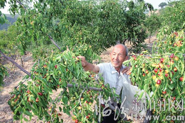臨汾新聞網訊 近日,霍州市辛置鎮宋莊村村民范德成正在采摘蜜棗。今年,他家的3畝蜜棗又喜獲豐收。眼下,正是蜜棗成熟時節。記者在霍州市辛置鎮見到,成片的蜜棗園青翠欲滴,一顆顆表皮光滑、果實飽滿的蜜棗掛滿了枝頭,村民們正忙著采摘,個個臉上露出喜悅的笑容。記者 范韶華攝