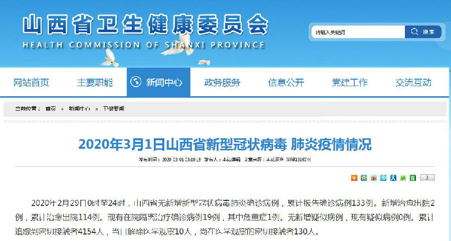 2020年2月29日0時至24時,山西省無新增新型冠狀病毒肺炎確診病例,累計報告確診病例133例。新增治愈出院2例,累計治愈出院114例。現有在院隔離治療確診病例19例,其中危重癥1例。無新增疑似病例,現有疑似病例0例。累計追蹤到密切接觸者4154人,當日解除醫學觀察10人,尚在醫學觀察的密切接觸者130人。