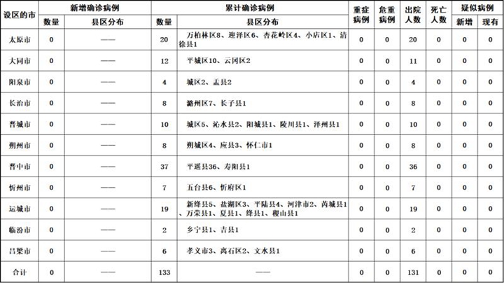 2020年3月10日0時至24時,山西省無新增新型冠狀病毒肺炎確診病例,累計報告確診病例133例。新增治愈出院4例,累計治愈出院131例。現有在院隔離治療確診病例2例。無新增疑似病例,現有疑似病例0例。累計追蹤到密切接觸者4193人,當日解除醫學觀察7人,尚在醫學觀察的密切接觸者57人。