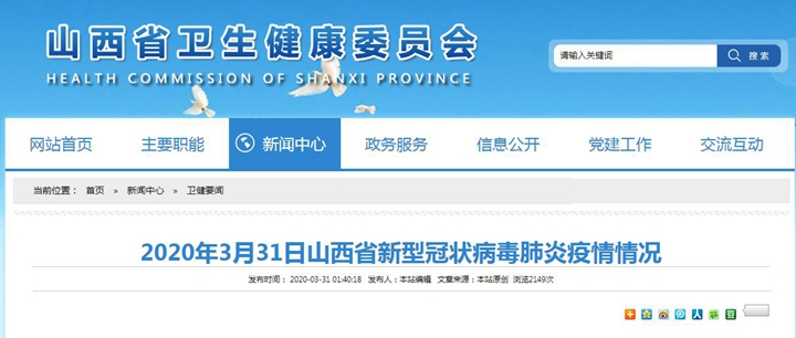 2020年3月30日0時至24時,山西省本地無新增新型冠狀病毒肺炎確診病例,累計報告確診病例133例,治愈出院133例。無新增疑似病例,現有疑似病例0例。