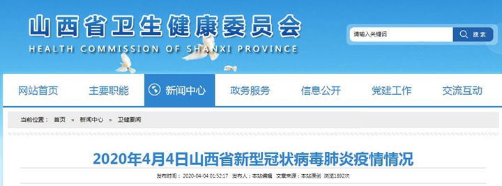 2020年4月3日0-24時,山西省無新增境外輸入確診病例,累計報告境外輸入確診病例4例。無新增境外輸入疑似病例,現(xiàn)有境外輸入疑似病例0例。