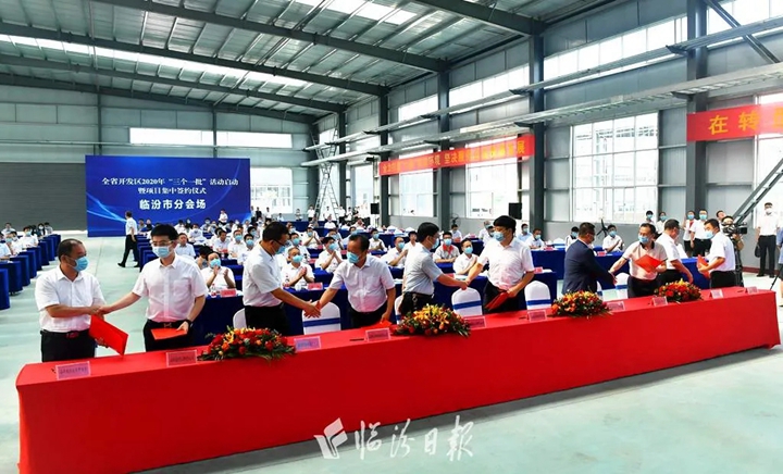 與全省同步舉行的臨汾分會場項目集中簽約儀式上,共簽約項目27個,總投資265.95億元。其中,堯都高新區福川未來交通科技產業園項目、臨汾開發區信創產業創新示范基地項目、侯馬開發區生物纖維素生產項目、洪洞開發區新建年產8萬噸精細化工品項目、襄汾開發區凌志環保襄汾生產基地項目等總投資193.7億元的10個項目進行了現場簽約。