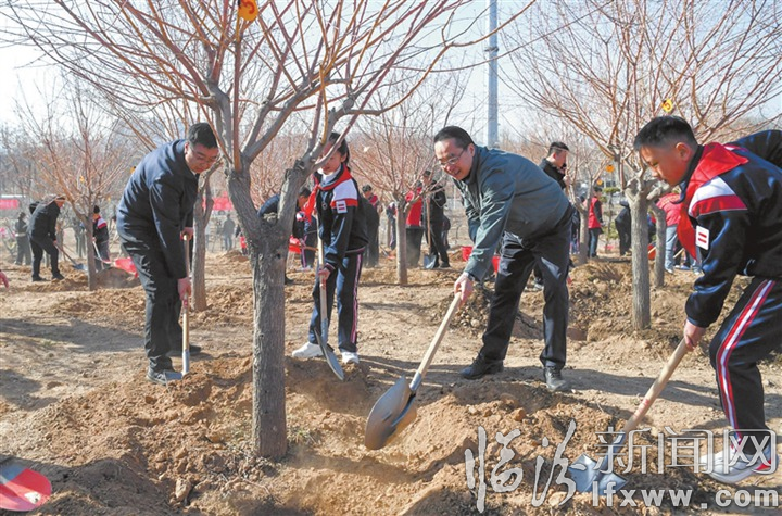 上午9時許,李云峰、王延峰等市領導來到植樹點,拿起鐵鍬與干部群眾、少先隊員一起投入到勞動中。大家揮鍬鏟土、培土圍堰、提水澆灌,合力種下金枝玉葉、龍柏、流蘇、海棠、紫薇、紫荊、臘梅、石榴、紅葉李、元寶楓、白皮松等樹苗,現場一派繁忙景象。在和煦的春風吹拂下,一株株新植樹苗錯落有致、生機盎然。植樹間隙,李云峰與一同植樹的少先隊員劉恬妤、蘭璽博親切交談,詢問學習生活、勞動鍛煉情況,希望他們從小養成尊重自然、熱愛自然的意識,積極參加勞動、植樹造林,勤奮學習、加強鍛煉,自覺踐行“最初中國·文明臨汾”三個“十小事”,德智體美勞全面發展,努力成長為祖國的棟梁之材。
